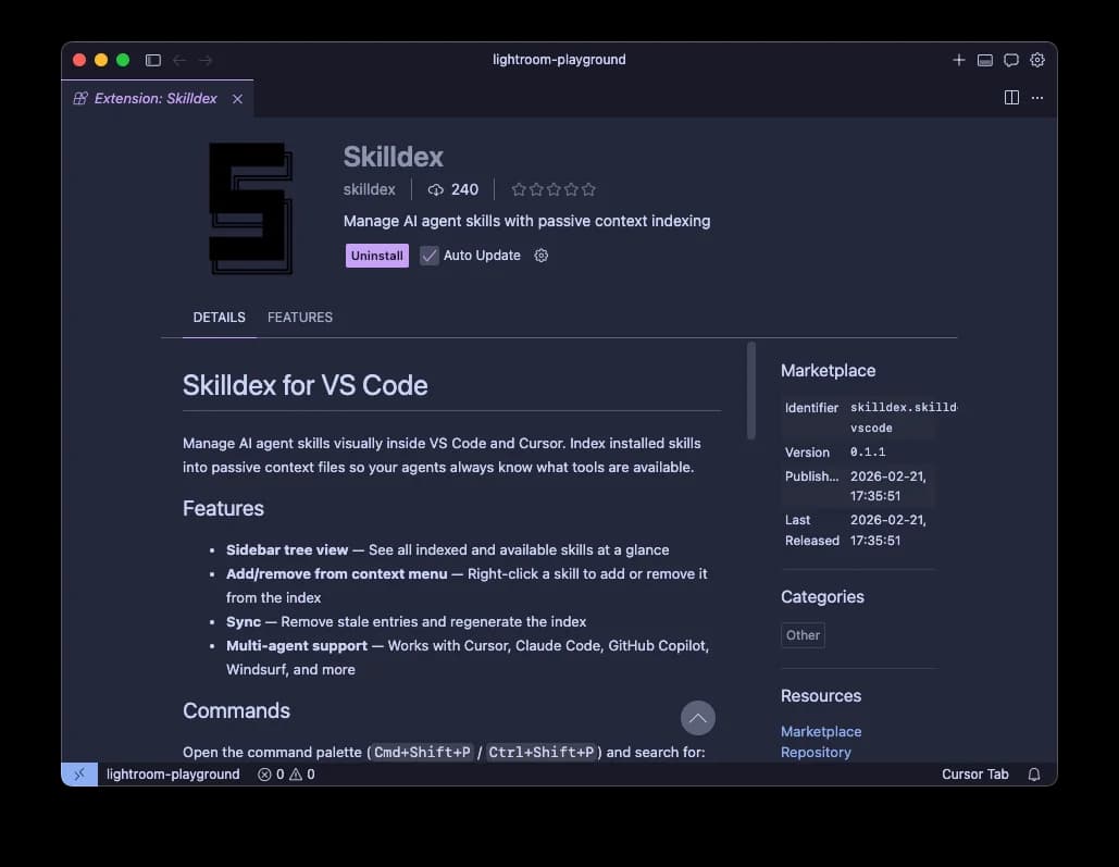 There's also an extension for both VS Code and Cursor. It adds a sidebar tree view showing all your indexed and available skills, with context menu actions for add/remove/sync. No terminal needed. Grab it on the VS Code Marketplace (works in Cursor too).
